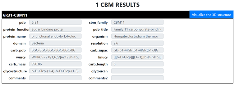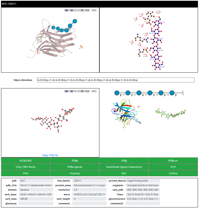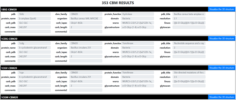 CBMcarb-DB is dedicated to display and analyse three-dimensional structures of carbohydrate binding modules (CBMs) in complex with carbohydrates, providing curated structural data about CBM carbohydrate complexes, binding interactions and carbohydrate conformation, with functional information on binding specificity.
