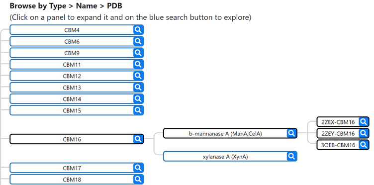 The search can be performed by the protein types included in each CBM family, by clicking on the desired panels to expand and acess each corresponding entry, or cliking in the blue search button to explore all the associated entries: