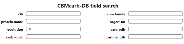 The database can be searched by keywords by textual input: i.e. organism, PDB code, UniProt accession number, protein name, CBM family, type of monosaccharide, oligosaccharide ligand, or textual fragments of the title of a publication: